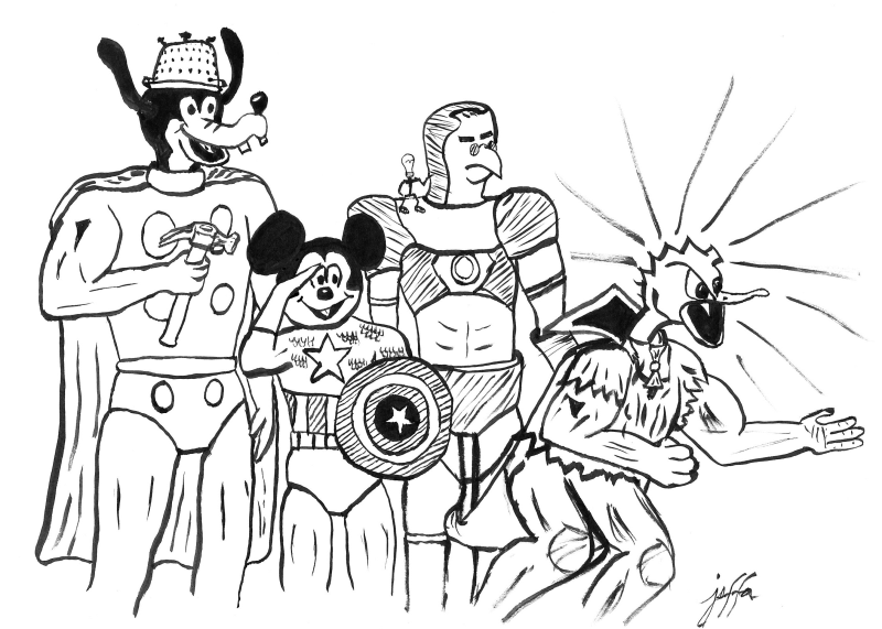 Mickey as Captain America seemed obvious as well. That cast them as the Avengers right there, so the next two who had to be there were Thor and Iron Man. Goofy's taller than the rest of the characters and I thought with the appropriately “goofy” equipment he'd work out.